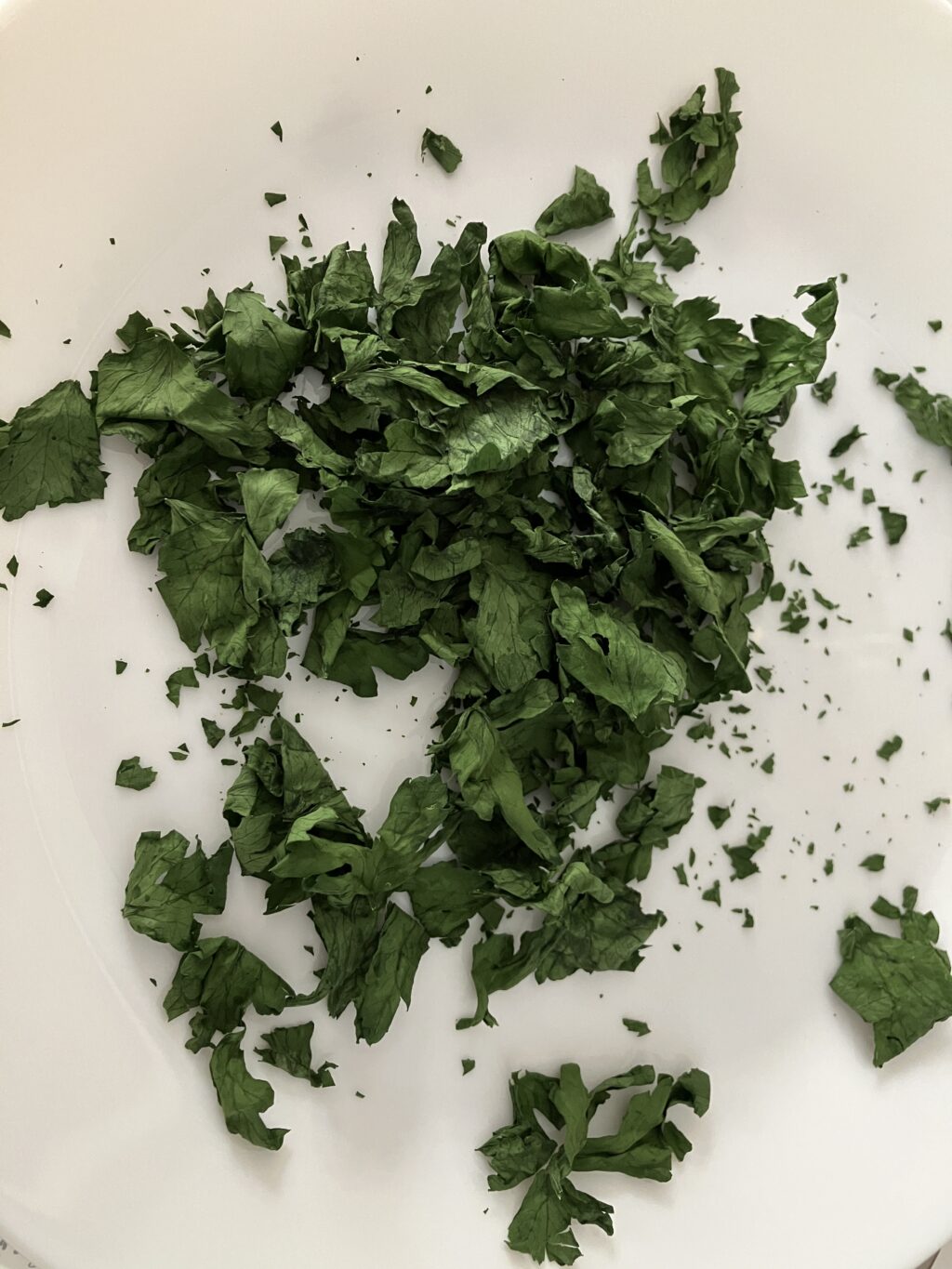 7.乾燥した葉を手で細かくバラバラにする。細い茎は取り除いて完成。