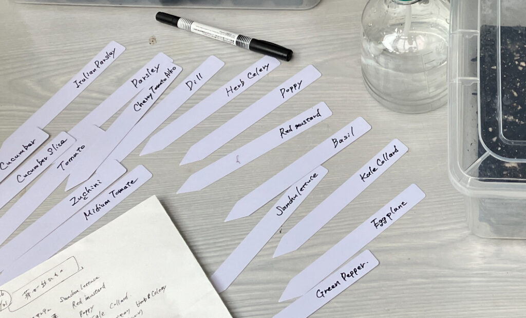 gardeningネームプレートの書き直し chianature 2026-04-11 もともと使っていたネームプレートが、3年使ってボロボロになったので、今回は、長めのプレートで、横向きに書いてみた。そろそろポリポットへ、鉢上げの季節。++++++++++