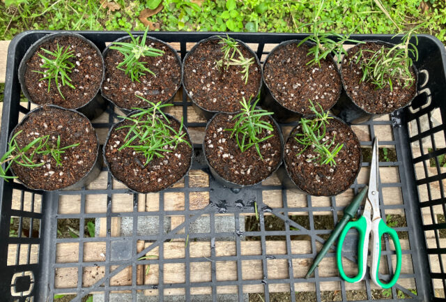 水差しにして、根が出たローズマリーを、ポリポットに定植。