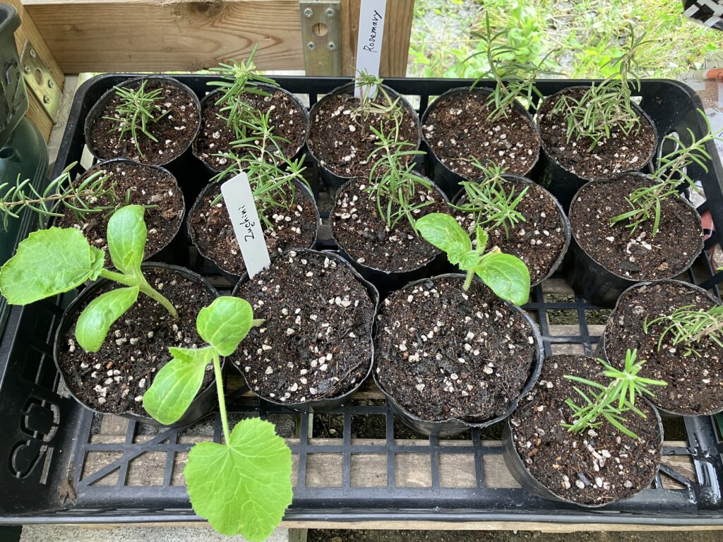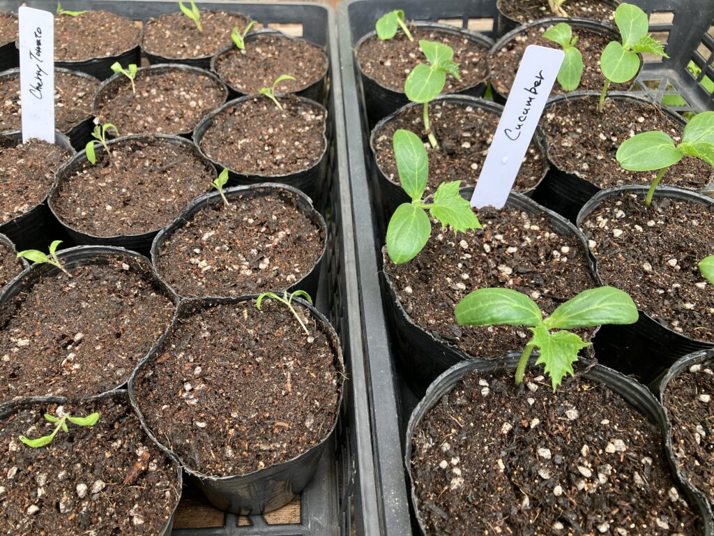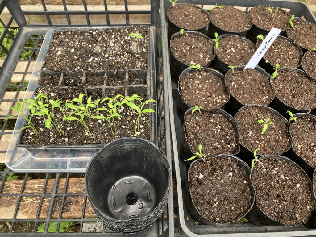 セルトレーで大きくなった夏野菜の苗を、ポリポットに鉢上げ。
